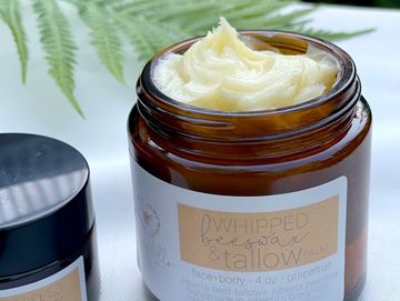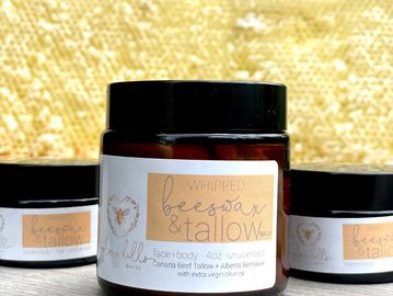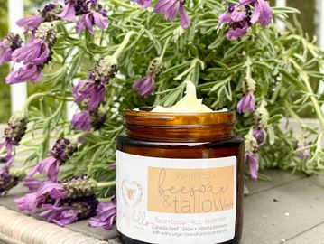 Tallow has been gaining traction in skincare for its natural, nutrient-rich profiles. The rendered cow fat closely resembles human sebum and is easily absorbable without clogging pores. This natural alternative to chemical-laden creams has been known to aid with aging, acne, eczema, severely dry skin, and so much more. The addition of beeswax firms up the balm and helps the skin to lock-in moisture, and it helps keep the tallow fresher longer with its antimicrobial properties.