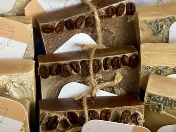 exfoliating, with coffee grounds throughout and beans on surface, contains coffee fragrance